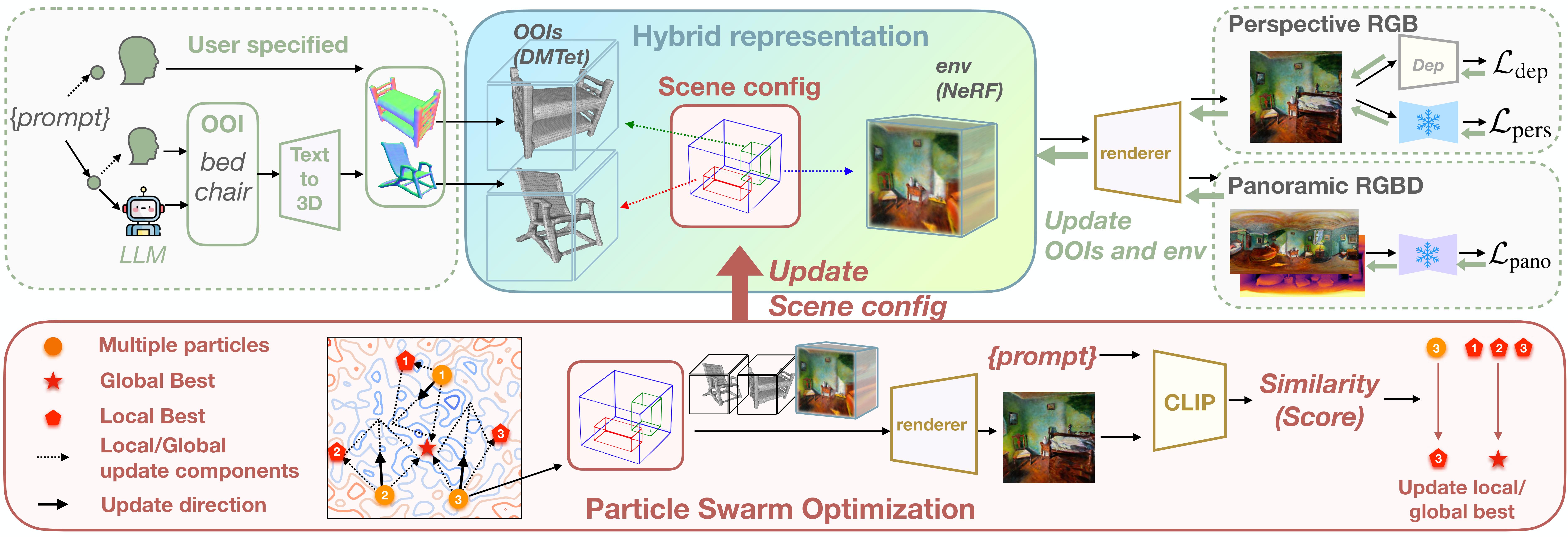 As we disentangle OOIs from the rest of the scene in our hybrid representation, we need to determine the configuration for each object, including coordinates, scaling factor, and rotation degree. We find that it is nontrivial to adopt gradient descent to update the low-dimensional config, but instead propose to use Particle Swarm Optimization (PSO) to automatically configure the scene's layout. Different from prior works that only employ perspectivew view distillation, we also incorporate LDM3D, a diffusion model finetuned on panoramic images in RGBD space to provide additional guidance. During the optimization process, LDM3D provides additional prior information: The RGBD knowledge yield supervision in depth, while panoramic knowledge mitigates the issues of limited views with perspective images and disambiguates the global structure of a scene.